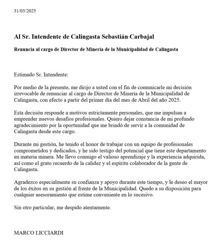 En medio de un creciente escándalo que ha sacudido el sector minero regional, el director de Minería de Calingasta, Licciardi, presentó su renuncia. La decisión se dio tras una serie de denuncias y controversias relacionadas con la Mesa Minería, que han puesto en entredicho tanto la transparencia como la ética en la gestión de este importante organismo. La situación ha generado un intenso debate en la comunidad minera y en la opinión pública, evidenciando tensiones y desafíos en la administración de recursos estratégicos.