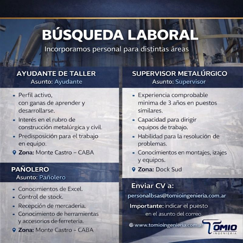 Para incorporarse a obra de fabricación y montaje de tanques en Proyecto Río Tinto (Puna). Si te interesa el desafío, postulate o compartí esta oportunidad: https://lnkd.in/dfFQ4Knb