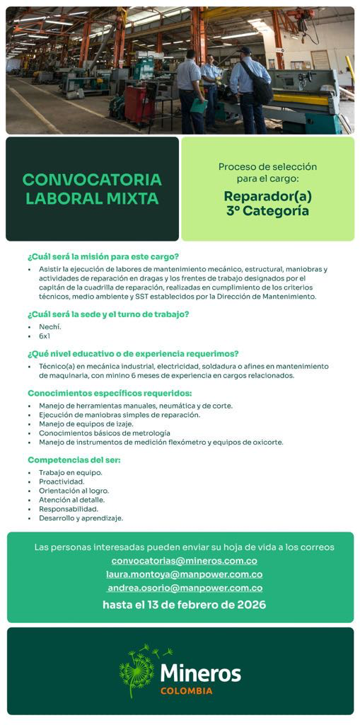 Requisito: Técnico(a) en mecánica, electricidad, soldadura o afines, con mínimo 6 meses de experiencia.