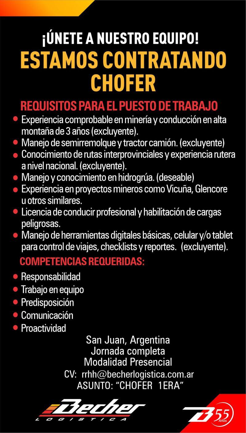Chofer de 1° categoría que tenga orientación por la seguridad, trabajo en equipo y la excelencia operativa.