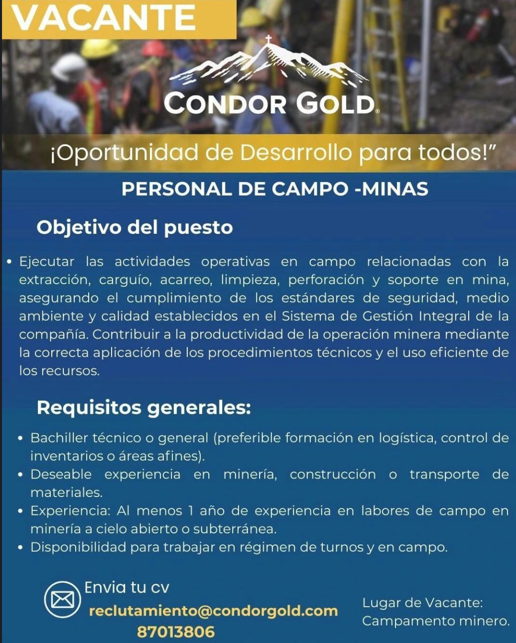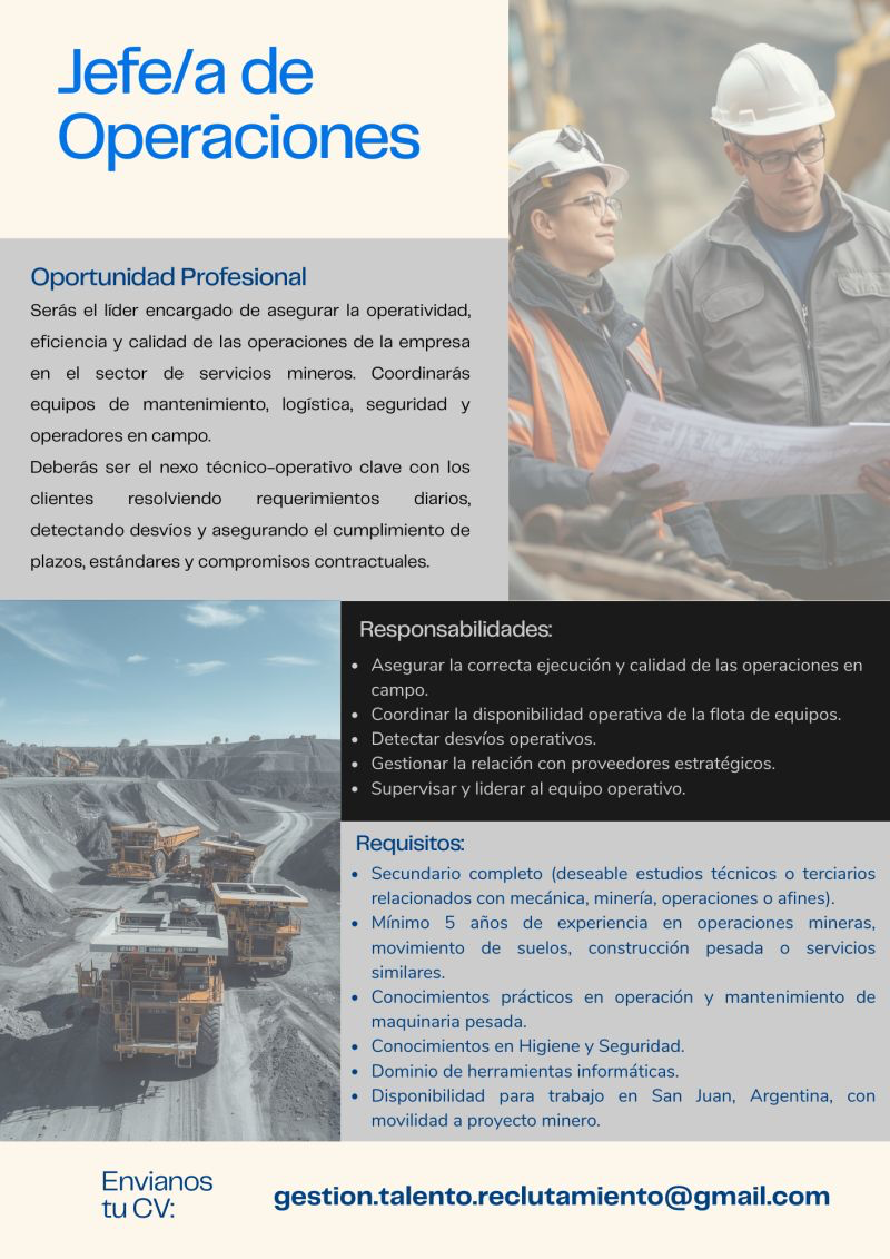 NUEVA BÚSQUEDA: Jefe/a de Operaciones – Minería (San Juan)