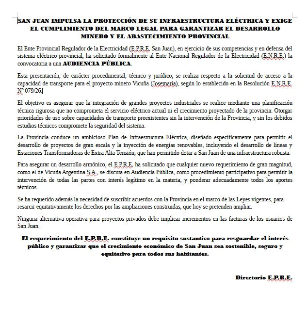 Ante el avance de Nación, el EPRE ha decidido plantar bandera para evitar que el corredor eléctrico se convierta en un enclave privado ajeno al control social. El organismo provincial exige que la magnitud del proyecto Vicuña Argentina S.A. obligue a una Audiencia Pública inmediata. No se trata de un mero trámite, sino de un mecanismo esencial para que técnicos y ciudadanos analicen si la infraestructura propuesta realmente beneficia a la comunidad o si solo sirve a los intereses de la minera.