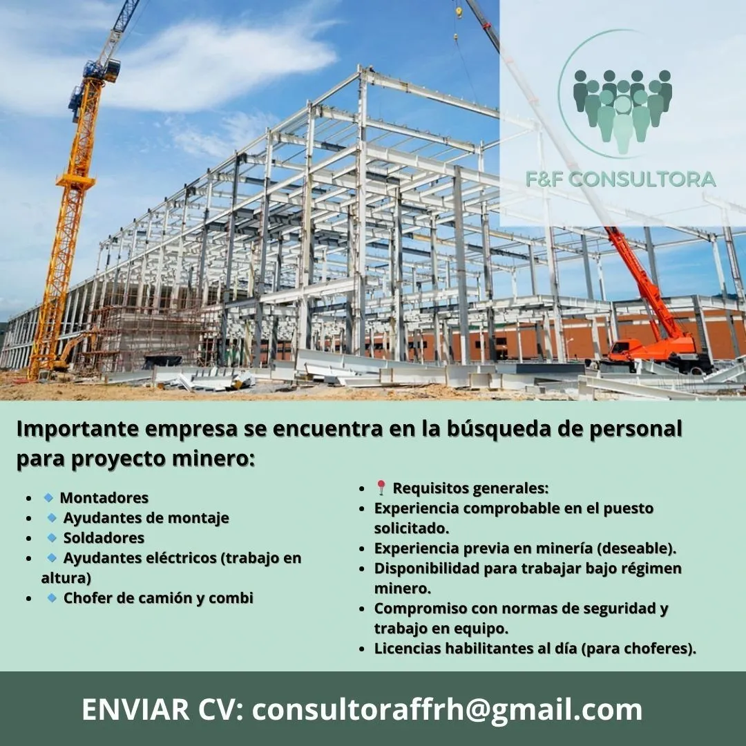 Montadores, Ayudantes de montaje, Soldadores, Ayudantes eléctricos (trabajo en altura) y Choferes de camión y combi. Con roster. Enviá tu CV indicando el puesto al que te postulás.